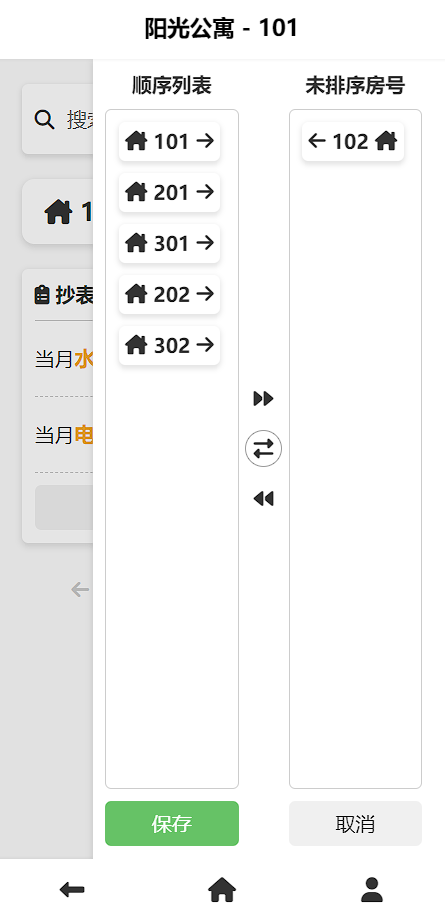 顺序列表可任意排序,抄表时,将按照列表顺序进行切换。未排序列表中的房号,将不会显示。